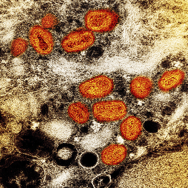 当地时间2022年7月26日,美国马里兰州,在实验室培养的感染细胞(棕色)中发现的猴痘颗粒(橙色)的彩色透射电子显微图。人民视觉 图
