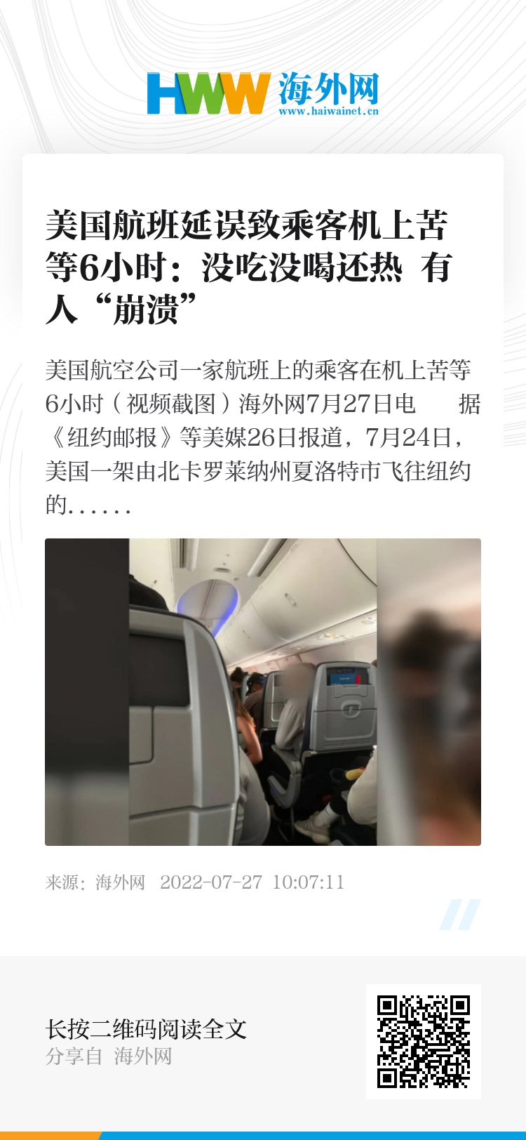 海外网7月27日电 据《纽约邮报》等美媒26日报道,7月24日,美国一架由北卡罗莱纳州夏洛特市飞往纽约的航班长时间停在跑道上。机上的乘客没吃没喝,也没有空调,这让不少人感到“精神崩溃”。