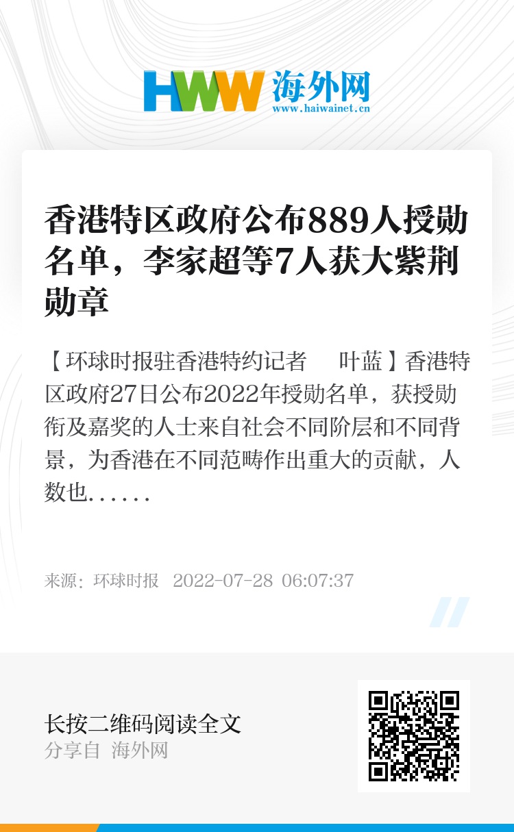 【环球时报驻香港特约记者 叶蓝】香港特区政府27日公布2022年授勋名单,获授勋衔及嘉奖的人士来自社会不同阶层和不同背景,为香港在不同范畴作出重大的贡献,人数也是历年来最多的。