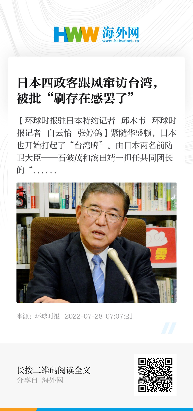 今年5月,也曾有5名自民党众议员窜访台湾,除与蔡英文等人举行会谈外,还为李登辉扫墓。台湾“中央社”27日引用岛内不具名学者的话说,日本前首相安倍的去世引发台日舆论担忧:日本政坛“最挺台支柱”不在了,日本挺台步伐可能放缓,而此次跨党派的“思考日本安全保障议员之会”成员访台,无疑是对台湾释放重要信息,即“关注台海安全早已是自民党内不分派系的共识,更是日本政界跨党派的共识”。