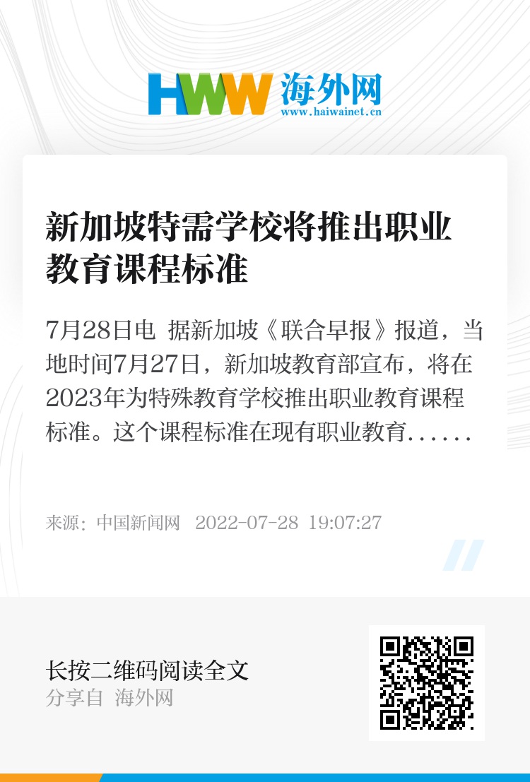中新网7月28日电 据新加坡《联合早报》报道,当地时间7月27日,新加坡教育部宣布,将在2023年为特殊教育学校推出职业教育课程标准。这个课程标准在现有职业教育标准的基础上改进,更广泛地定义工作,以便为学生提供更多元的工作途径。