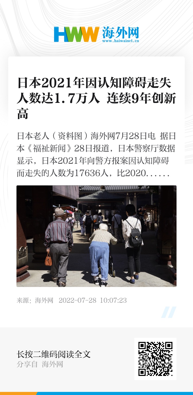 海外网7月28日电 据日本《福祉新闻》28日报道,日本警察厅数据显示,日本2021年向警方报案因认知障碍而走失的人数为17636人,比2020年增加71人,比2012年首次统计时(9607人)增加1.8倍,连续9年创历史新高。