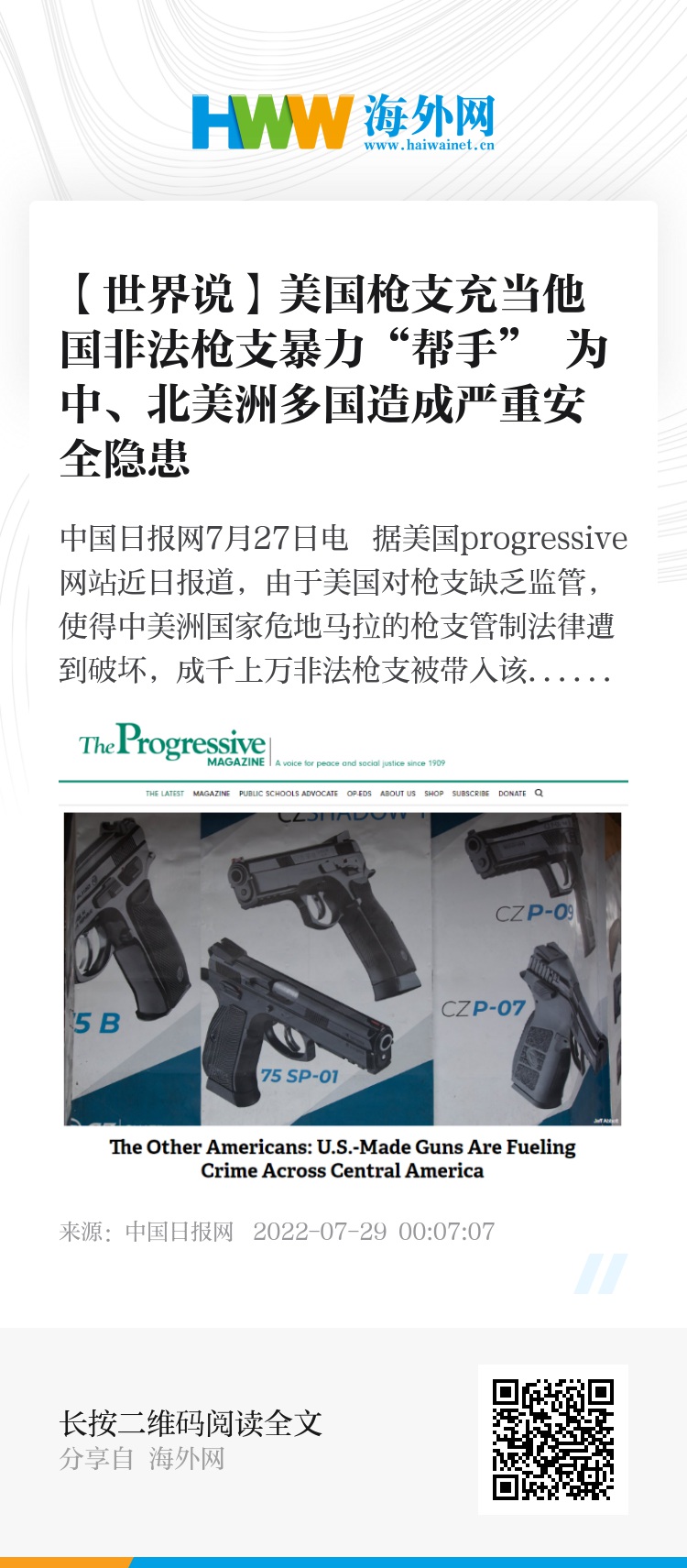 中国日报网7月27日电 据美国progressive网站近日报道,由于美国对枪支缺乏监管,使得中美洲国家危地马拉的枪支管制法律遭到破坏,成千上万非法枪支被带入该国。