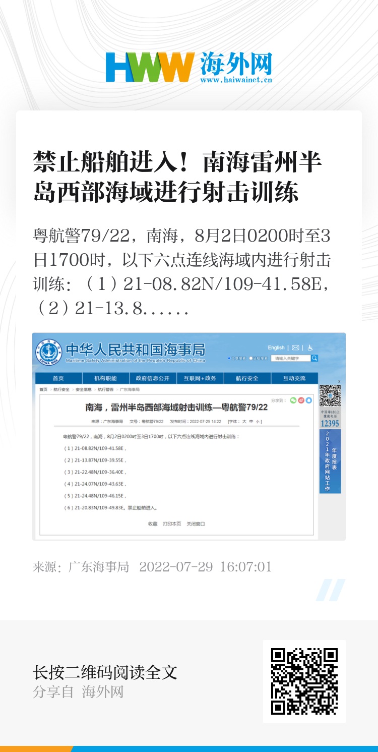 粤航警79/22,南海,8月2日0200时至3日1700时,以下六点连线海域内进行射击训练: