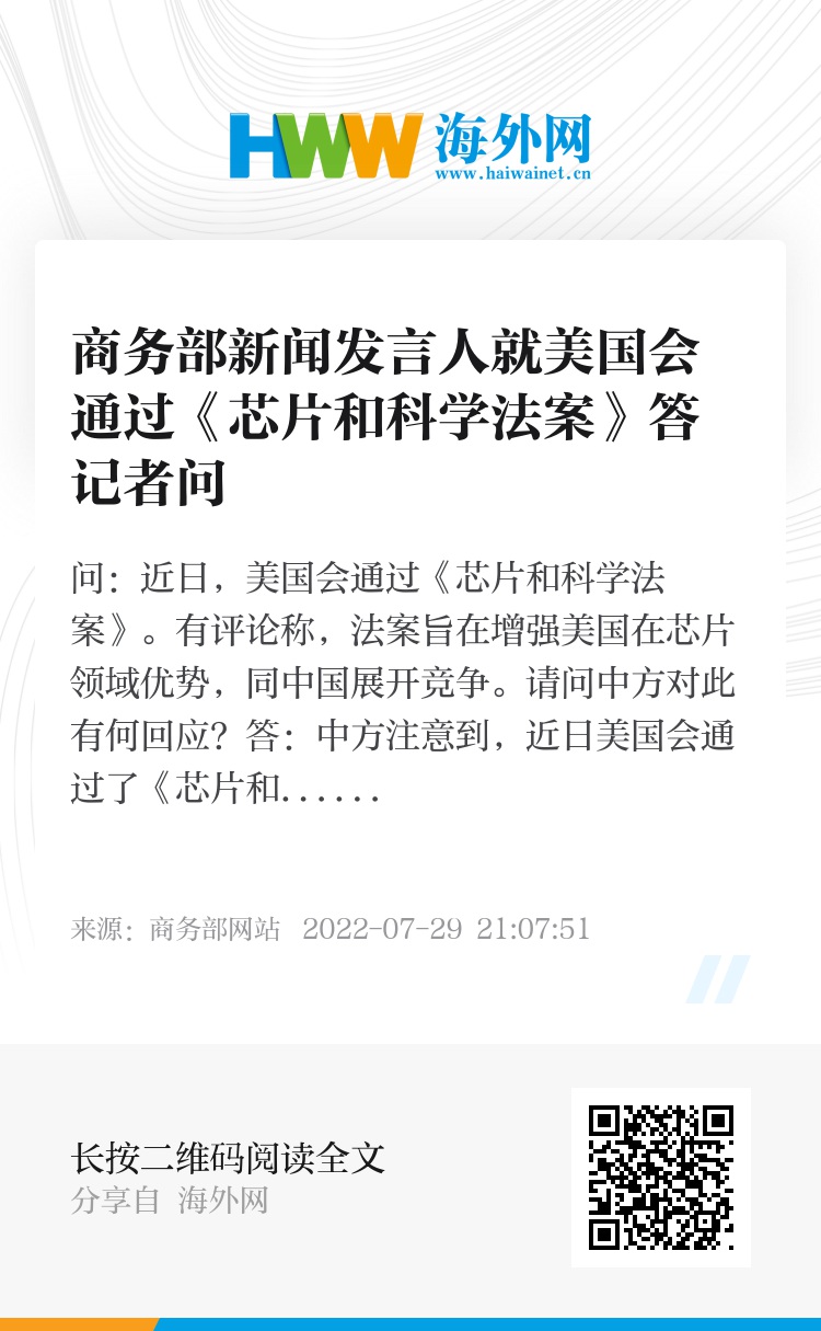 问:近日,美国会通过《芯片和科学法案》。有评论称,法案旨在增强美国在芯片领域优势,同中国展开竞争。请问中方对此有何回应?