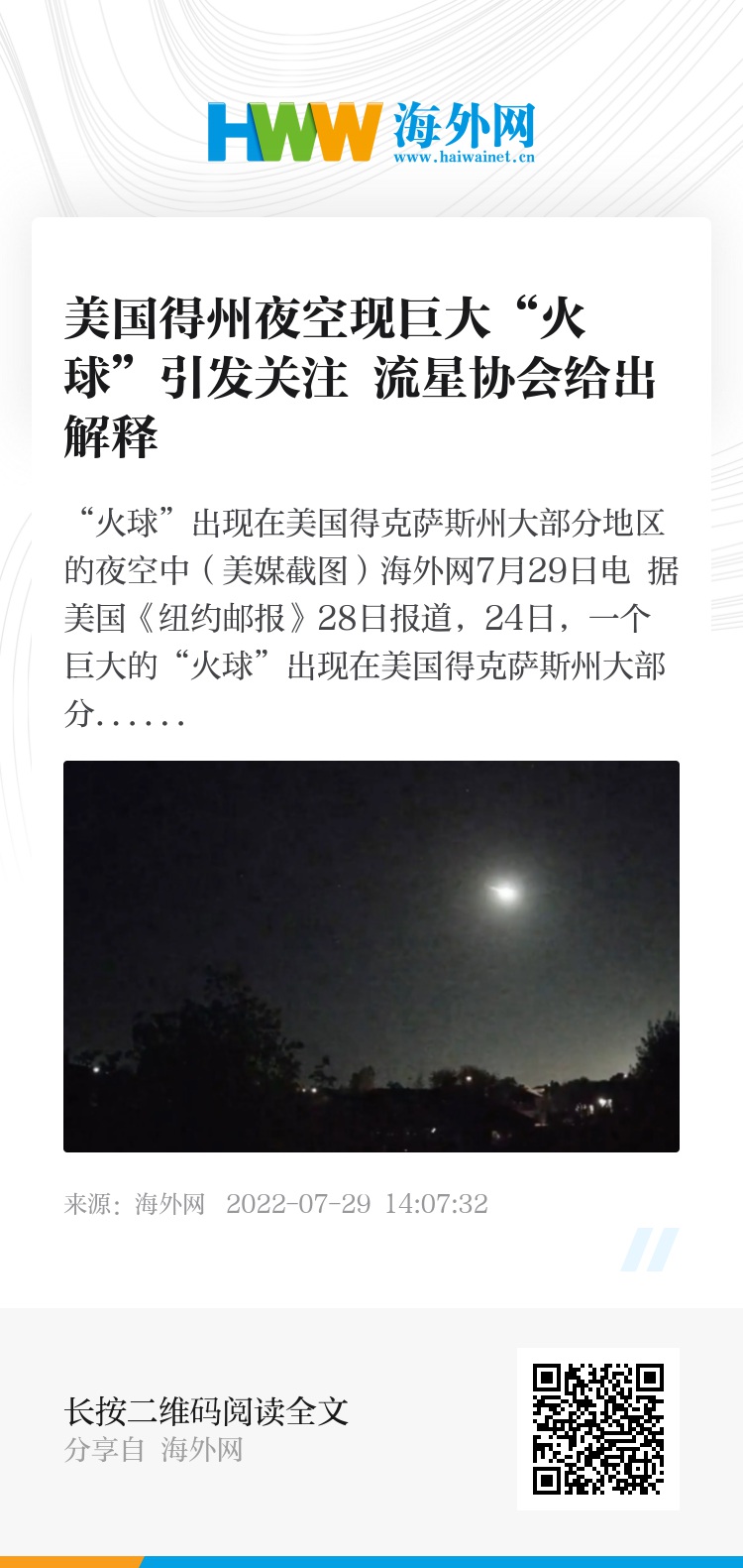 海外网7月29日电 据美国《纽约邮报》28日报道,24日,一个巨大的“火球”出现在美国得克萨斯州大部分地区的夜空中,引发当地人关注。对于“火球”究竟是什么,美国流星协会也给出了解释。