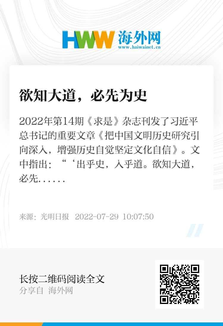 “欲知大道,必先为史”出自清代著名思想家龚自珍的《定盦文集·续集·尊史》。其大意为要掌握大道,必须先研究蕴含着大道的历史。这里的大道,是治国理政之道、国家兴衰之道,是我们从历史当中涵养的自觉、在文化当中生发的自信。《尊史》的第一句话便指出了历史的重要性:“史之尊,非其职语言、司谤誉之谓,尊其心也。”历史作为一个民族、一个国家形成、发展的真实记录,得失的总结,是最好的教科书,也是最好的清醒剂,所以,“出乎史,入乎道”,要增强历史自觉、坚定文化自信,必须返回历史中去把握。