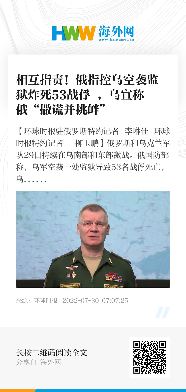 【环球时报驻俄罗斯特约记者 李琳佳 环球时报特约记者 柳玉鹏】俄罗斯和乌克兰军队29日持续在乌南部和东部激战。俄国防部称,乌军空袭一处监狱导致53名战俘死亡,乌方对此否认。此外,俄还指责乌对俄本土实施打击,并企图在俄策划恐袭。