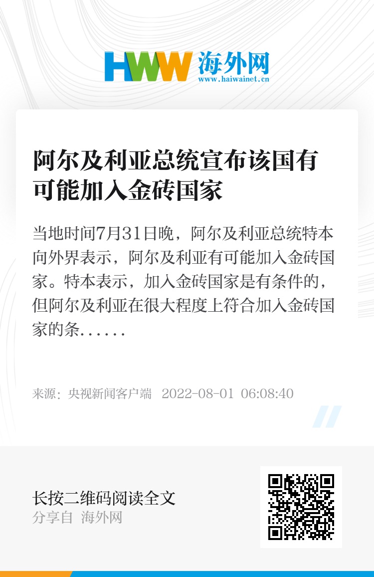 当地时间7月31日晚,阿尔及利亚总统特本向外界表示,阿尔及利亚有可能加入金砖国家。