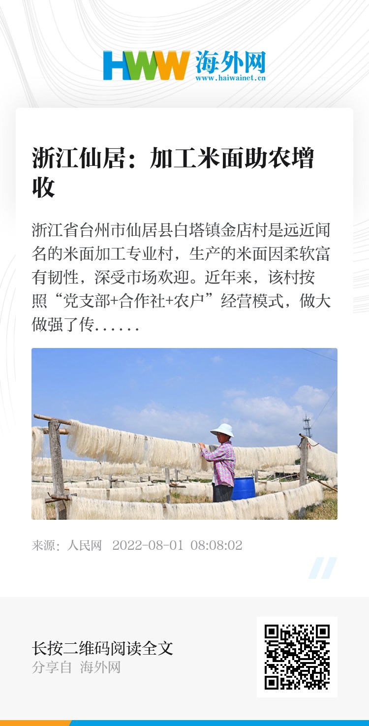 浙江省台州市仙居县白塔镇金店村是远近闻名的米面加工专业村,生产的米面因柔软富有韧性,深受市场欢迎。近年来,该村按照“党支部+合作社+农户”经营模式,做大做强了传统米面产业,既解决了当地留守人员在家门口就业,又成为该村农民增收致富的主要产业。图为2022年7月31日,浙江省台州市仙居县白塔镇金店村一家米面加工厂的农民在晾晒米面。王华斌摄(人民图片网)