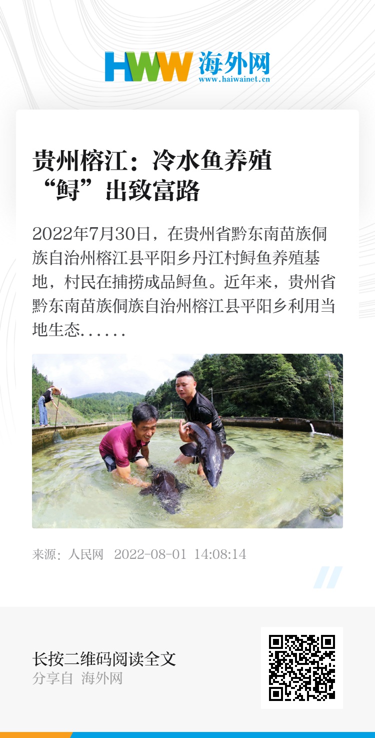 2022年7月30日,在贵州省黔东南苗族侗族自治州榕江县平阳乡丹江村鲟鱼养殖基地,村民在捕捞成品鲟鱼。近年来,贵州省黔东南苗族侗族自治州榕江县平阳乡利用当地生态优良、水质清凉的自然条件,结合市场需求,以“党支部+合作社+农户”模式,发展以鲟鱼为主的特色生态冷水鱼养殖,拓宽群众增收渠道,助力乡村振兴。李长华摄(人民图片网)