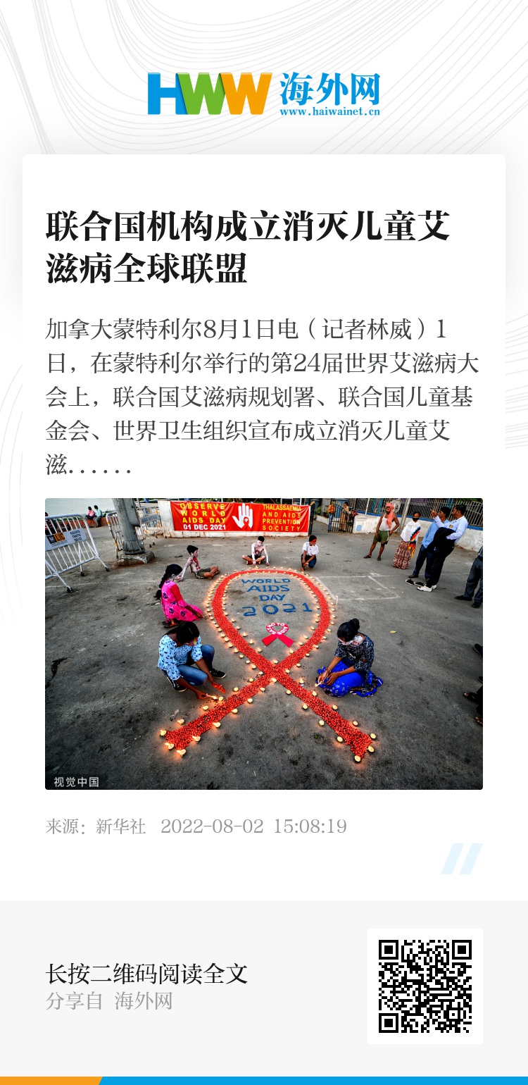 新华社加拿大蒙特利尔8月1日电(记者林威)1日,在蒙特利尔举行的第24届世界艾滋病大会上,联合国艾滋病规划署、联合国儿童基金会、世界卫生组织宣布成立消灭儿童艾滋病全球联盟,以确保2030年前实现无感染艾滋病毒儿童被拒绝治疗的目标,并防止新的婴儿感染艾滋病毒。