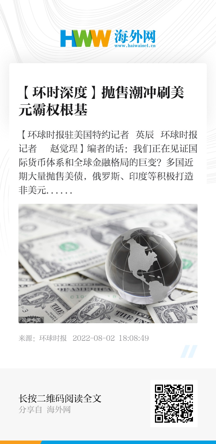 【环球时报驻美国特约记者 英辰 环球时报记者 赵觉珵】编者的话:我们正在见证国际货币体系和全球金融格局的巨变?多国近期大量抛售美债,俄罗斯、印度等积极打造非美元结算体系,以色列推动外汇储备更加多元化——在美联储激进加息,以及俄乌军事冲突爆发后美国利用金融霸权肆意制裁俄罗斯的影响下,各国去美元化的行动不断加速。“我们正在见证全球去美元化的开始吗?”这是不少媒体提出的问题。哈佛大学经济学教授罗戈夫预测,美元在全球金融体系的主导地位很可能会在20年内终结。