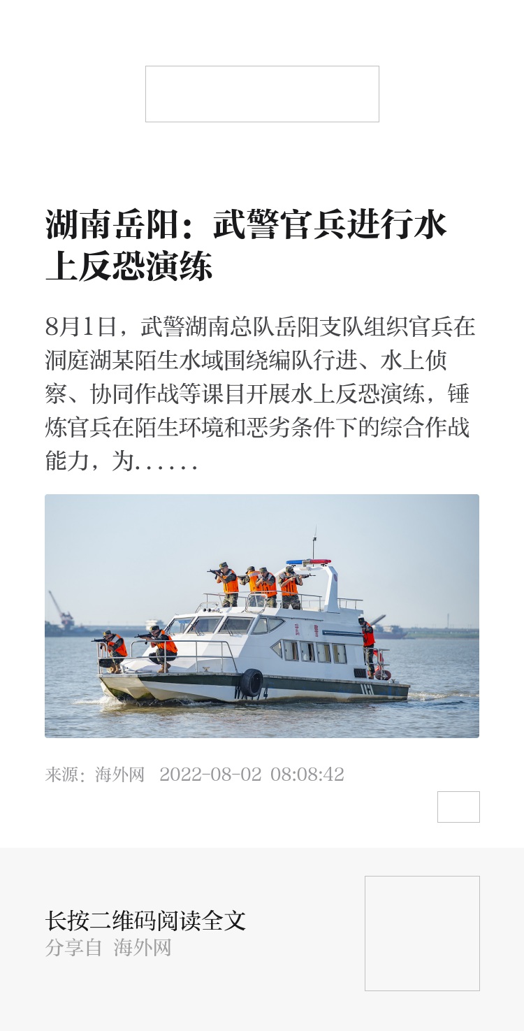8月1日,武警湖南总队岳阳支队组织官兵在洞庭湖某陌生水域围绕编队行进、水上侦察、协同作战等课目开展水上反恐演练,锤炼官兵在陌生环境和恶劣条件下的综合作战能力,为今后遂行多样化任务提供坚强的能力支撑。图片来源:视觉中国