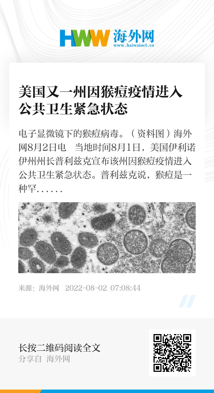 海外网8月2日电 当地时间8月1日,美国伊利诺伊州州长普利兹克宣布该州因猴痘疫情进入公共卫生紧急状态。普利兹克说,猴痘是一种罕见但潜在的严重疾病,需要充分调动所有可用的公共卫生资源来防止病毒传播。