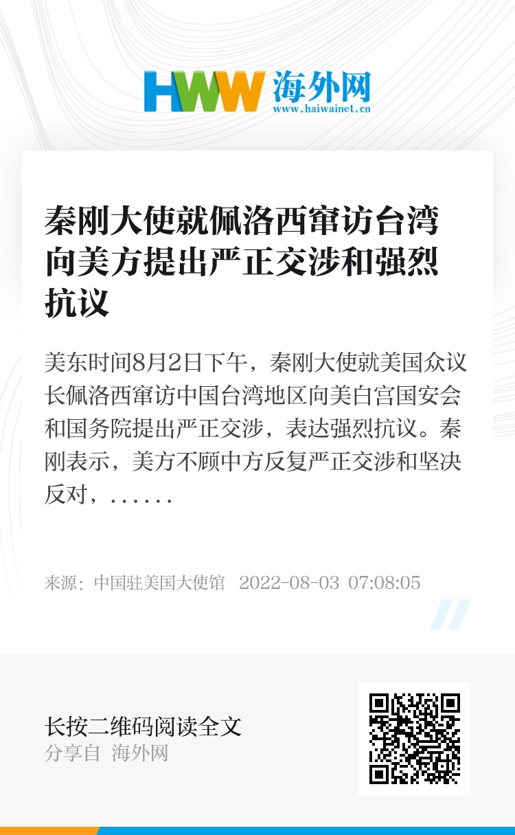 美东时间8月2日下午,秦刚大使就美国众议长佩洛西窜访中国台湾地区向美白宫国安会和国务院提出严正交涉,表达强烈抗议。