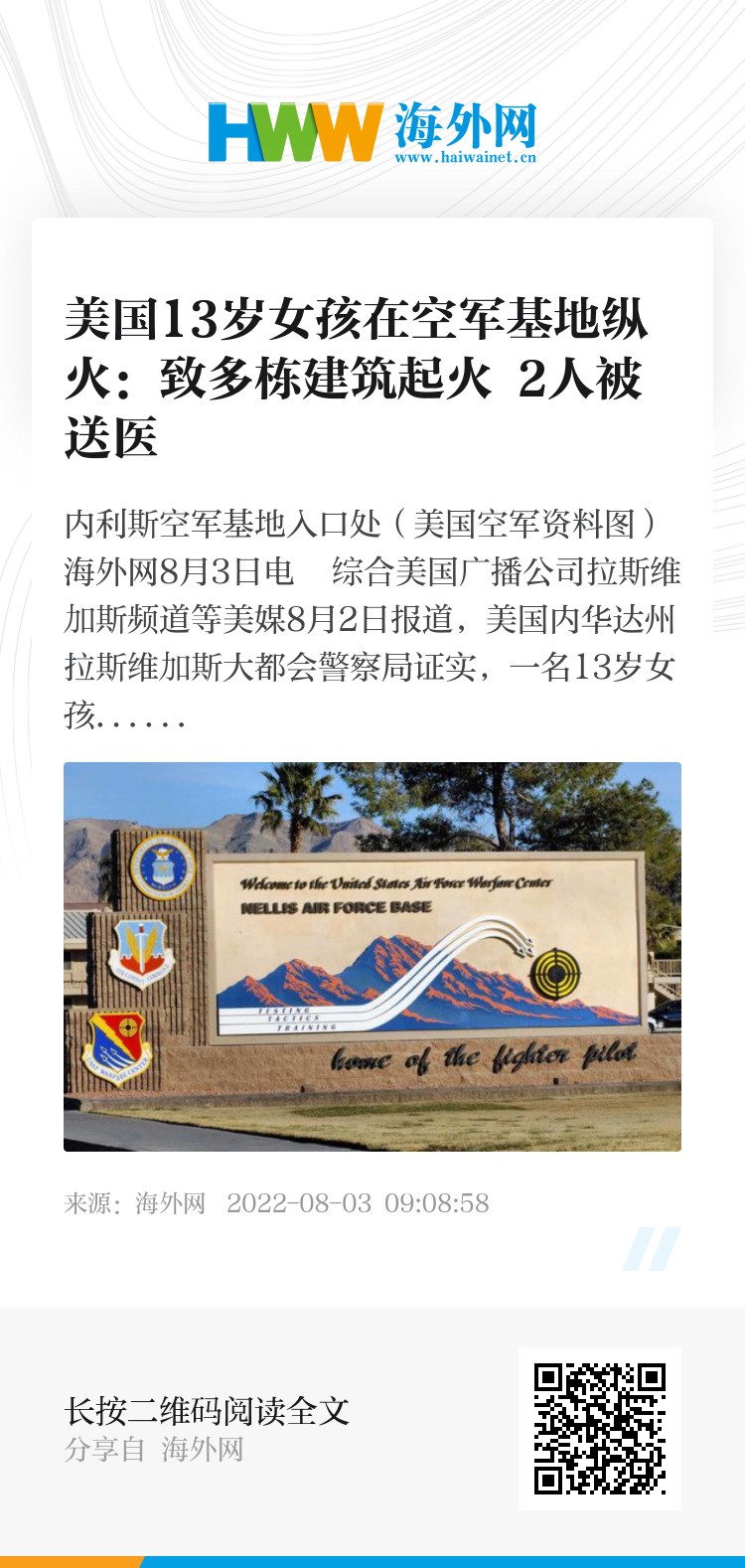 警方表示,7月30日早晨,这名女孩涉嫌在在位于拉斯维加斯的内利斯空军基地内纵火,导致多栋建筑起火。火灾还导致两人因吸入烟雾被送往医院治疗。基地方面并未对建筑的受损情况进行详细说明,只表示正全力配合警方调查。