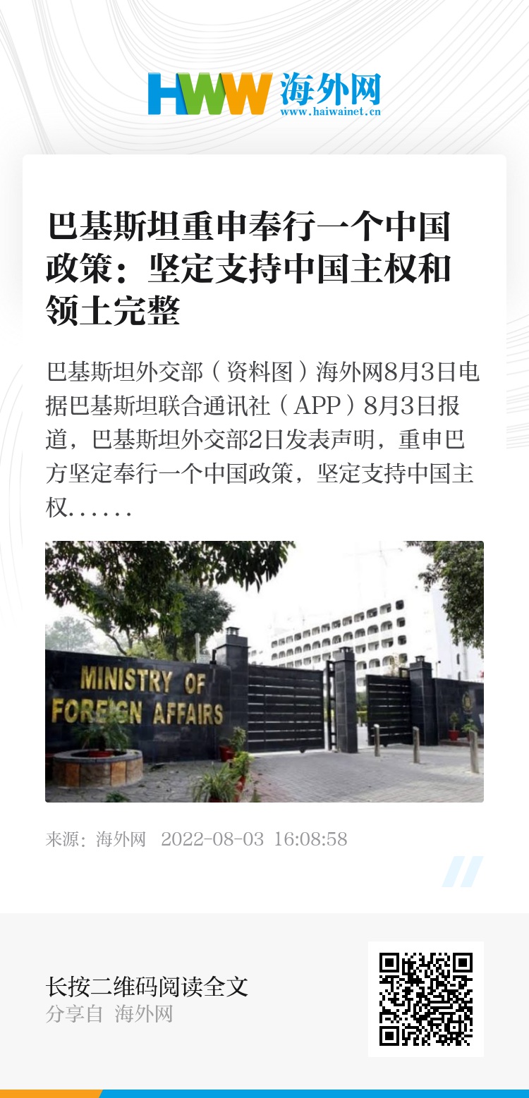 海外网8月3日电 据巴基斯坦联合通讯社(APP)8月3日报道,巴基斯坦外交部2日发表声明,重申巴方坚定奉行一个中国政策,坚定支持中国主权和领土完整。