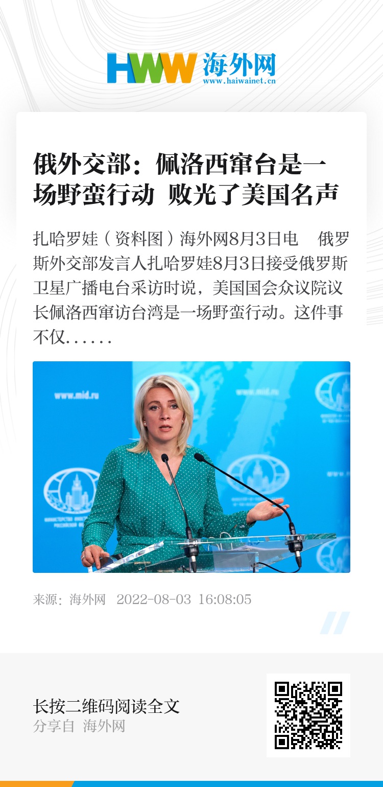 海外网8月3日电 俄罗斯外交部发言人扎哈罗娃8月3日接受俄罗斯卫星广播电台采访时说,美国国会众议院议长佩洛西窜访台湾是一场野蛮行动。这件事不仅说明美国极不重视其它国家,还败光了仅剩的名声。