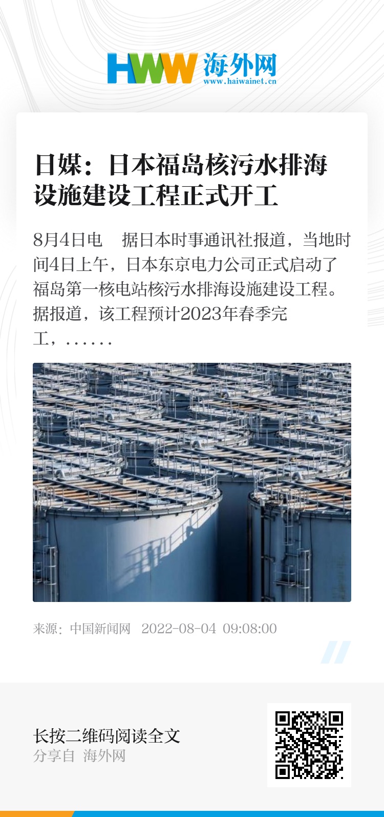 中新网8月4日电 据日本时事通讯社报道,当地时间4日上午,日本东京电力公司正式启动了福岛第一核电站核污水排海设施建设工程。