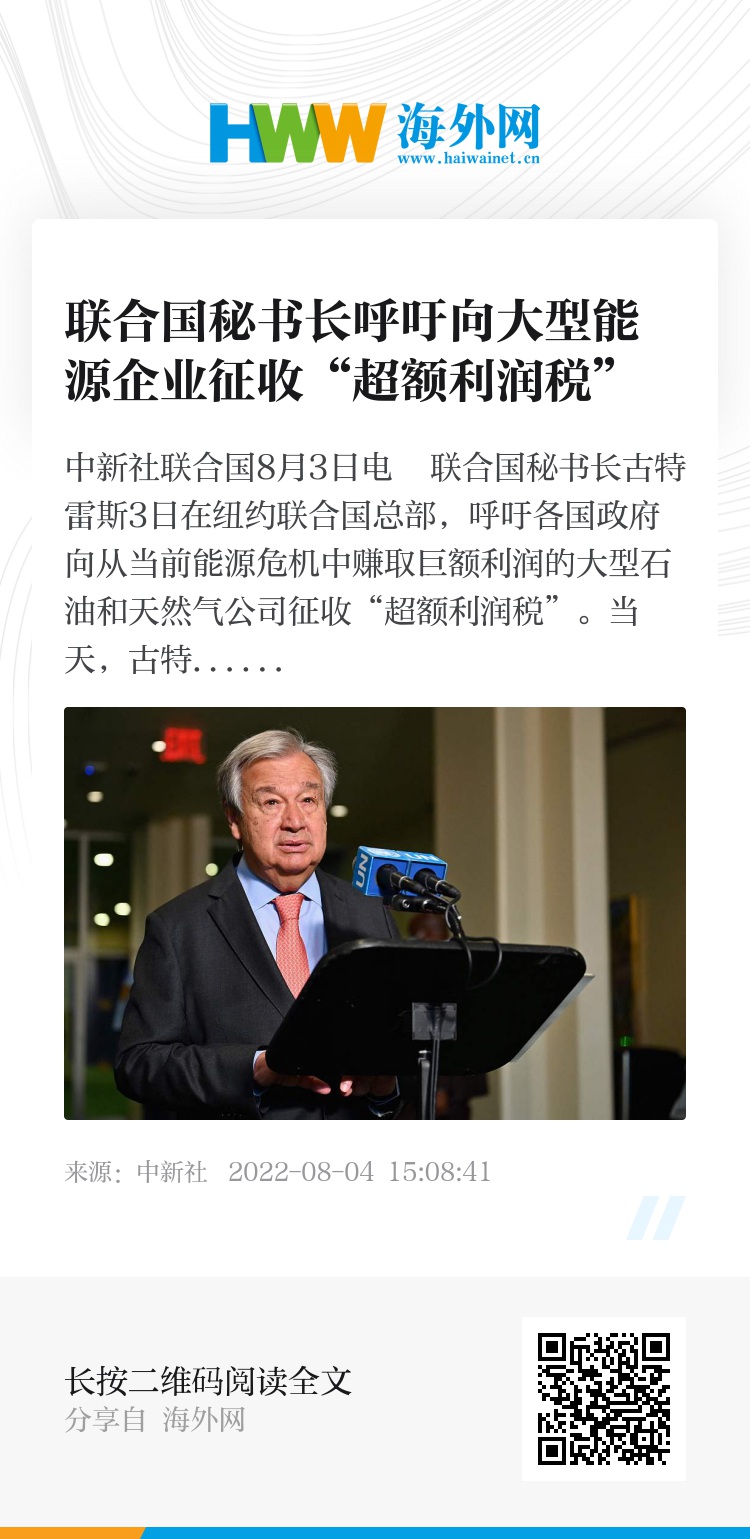 中新社联合国8月3日电 联合国秘书长古特雷斯3日在纽约联合国总部,呼吁各国政府向从当前能源危机中赚取巨额利润的大型石油和天然气公司征收“超额利润税”。