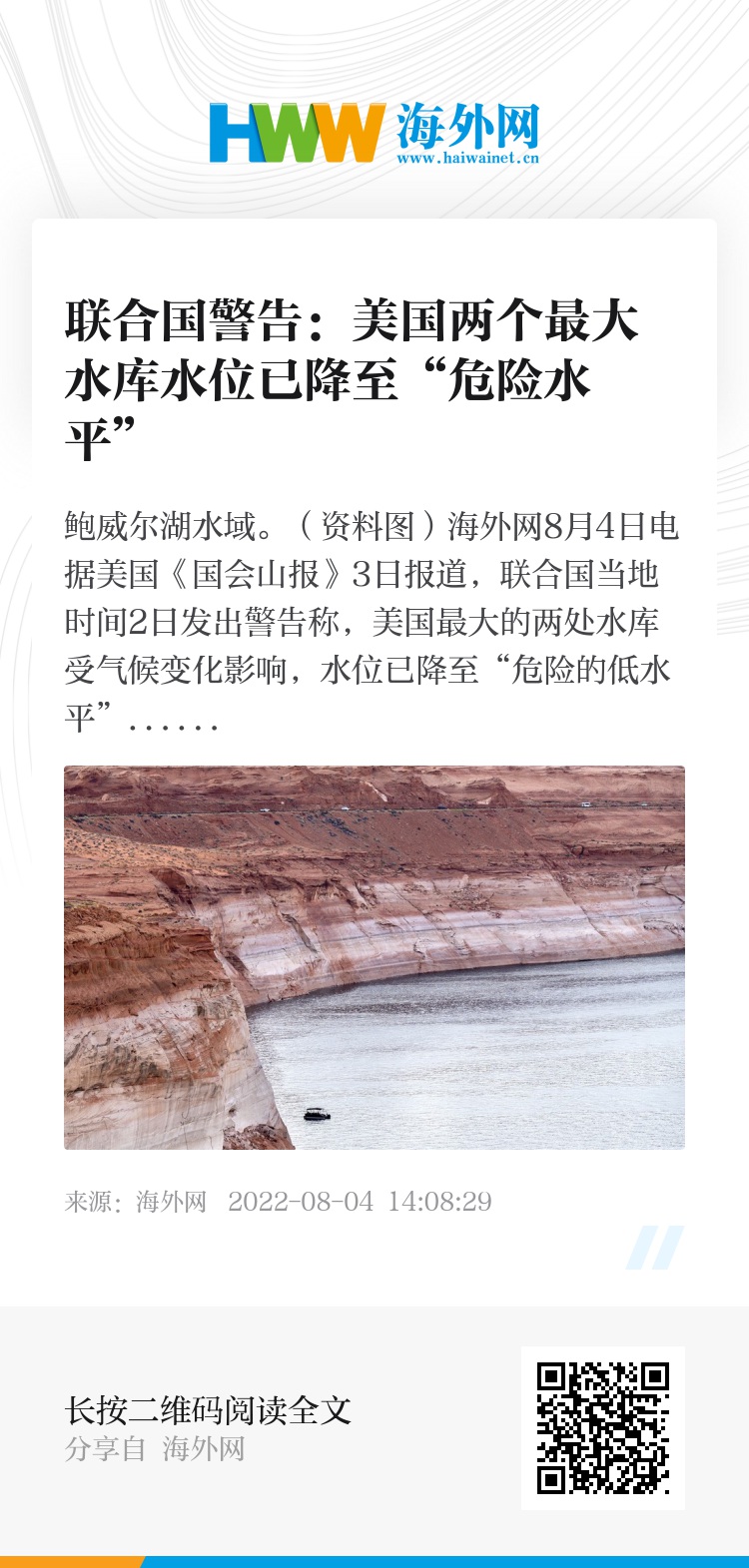 海外网8月4日电 据美国《国会山报》3日报道,联合国当地时间2日发出警告称,美国最大的两处水库受气候变化影响,水位已降至“危险的低水平”。