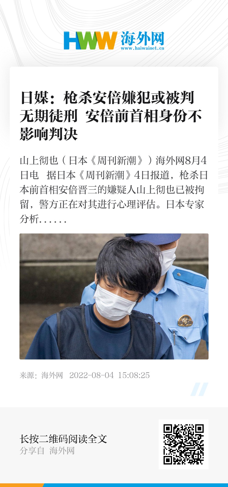 海外网8月4日电 据日本《周刊新潮》4日报道,枪杀日本前首相安倍晋三的嫌疑人山上彻也已被拘留,警方正在对其进行心理评估。日本专家分析,安倍的前首相身份不会对判决造成影响,山上彻也很可能被判无期徒刑。