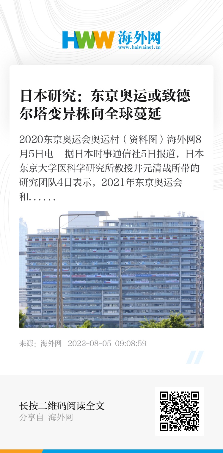 该研究团队以国际数据库登记的新冠病毒基因组数据为基础进行了分析,研究发现,2021年夏季,“AY.29”毒株在日本出现,并迅速成为该国第五波主流毒株。奥运会后,这种毒株分别在美国、英国、韩国、中国香港、秘鲁等20个国家和地区被发现。井元表示:“虽然日本按照规定程序,对出入境人员及奥运村运动员进行了检查,但还是出现了新冠患者。”