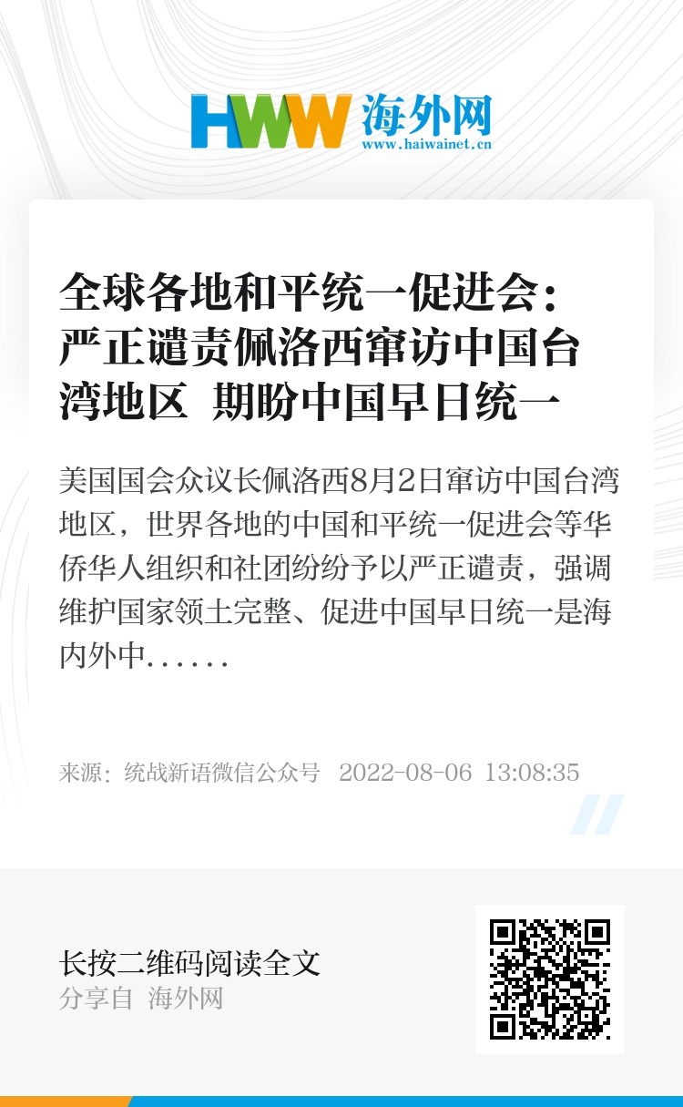美国国会众议长佩洛西8月2日窜访中国台湾地区,世界各地的中国和平统一促进会等华侨华人组织和社团纷纷予以严正谴责,强调维护国家领土完整、促进中国早日统一是海内外中华儿女的由衷期盼。