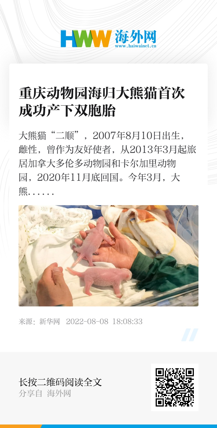 32468185,.重庆动物园海归大熊猫首次成功产下双胞胎,.2022-08-08 18:04:33,.204428,.张青津