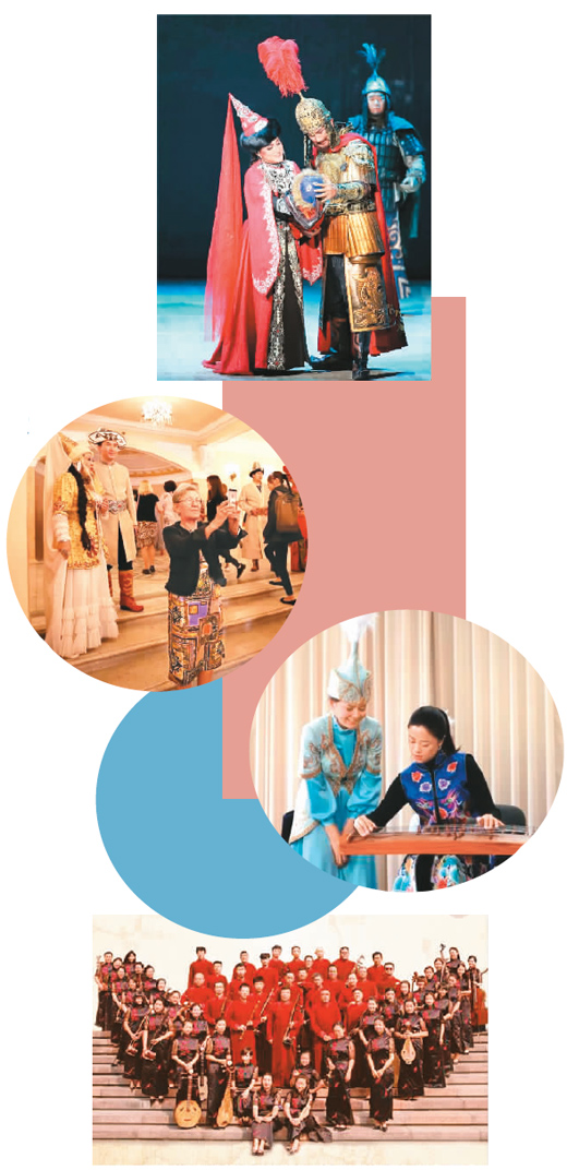 图片从上至下依次为:歌剧《玛纳斯》在吉尔吉斯斯坦演出、吉尔吉斯斯坦观众与《玛纳斯》演员互动拍照、哈萨克斯坦国家音乐学院学生与中国民乐演奏家交流、中国歌剧舞剧院民族乐团赴哈萨克斯坦演出的海报。受访者供图