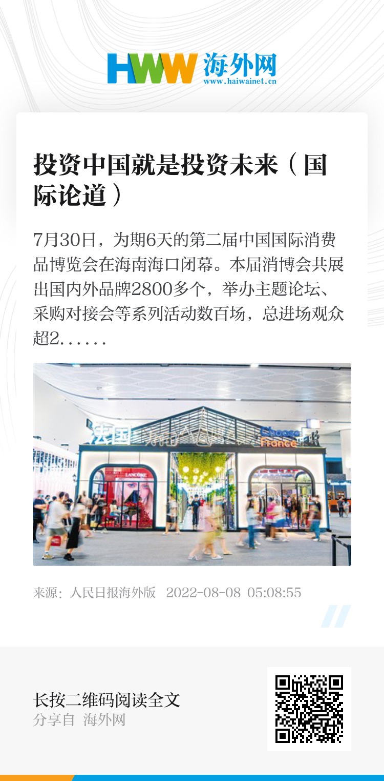 深谙国际市场的外商不愿错过中国市场,因为投资中国就是投资未来。7月30日,第二届中国国际消费品博览会在海口完美收官,效果远超预期。菲律宾《马尼拉时报》评论指出,在本届消博会上,中国市场对国际企业的吸引力再次彰显。塔斯社在报道第二届消博会时也指出,跨国企业、全球知名公司以及年轻品牌都对中国市场的驱动力和海南的营商环境表达了信心。在世界经济增长放缓的背景下,巨大的中国市场对许多企业来说发挥了“救生圈”“销售火车头”或“新商业模式试验场”的作用。