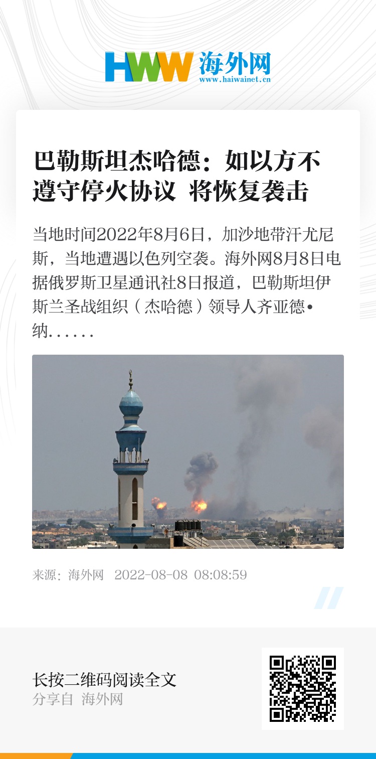海外网8月8日电 据俄罗斯卫星通讯社8日报道,巴勒斯坦伊斯兰圣战组织(杰哈德)领导人齐亚德∙纳哈拉表示,如果以色列政府不遵守停火条件,该组织将放弃与以色列达成的停火协议并在加沙地带恢复袭击。