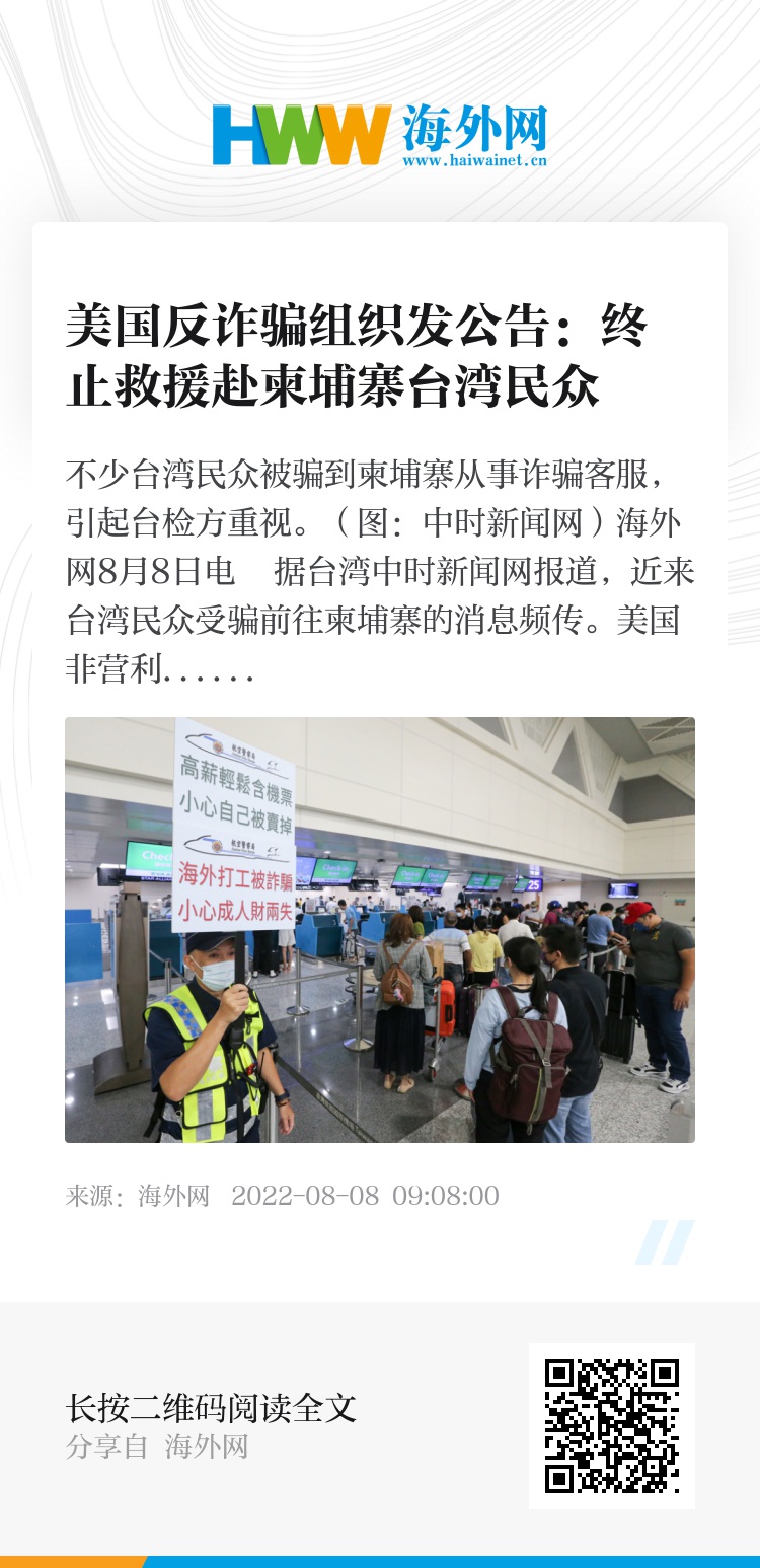 海外网8月8日电 据台湾中时新闻网报道,近来台湾民众受骗前往柬埔寨的消息频传。美国非营利组织“全球反诈骗组织”发出公告称,拒绝救援8月3日起前往柬埔寨的台湾地区民众。