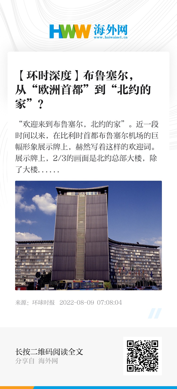 乌克兰冲突升级成了“欧洲安全分水岭”,欧洲国家对安全的重视程度超过冷战结束后的任何时期。在这样的背景下,布鲁塞尔挂出写有“欢迎来到布鲁塞尔,北约的家”的展示牌,而淡化“欧洲首都”这一城市名片的做法也就不足为奇了。但不管怎样,对于布鲁塞尔这座城市来说,北约只有一座办公大楼,但它“欧洲区”内的欧盟机构办公大楼可不止一座。
