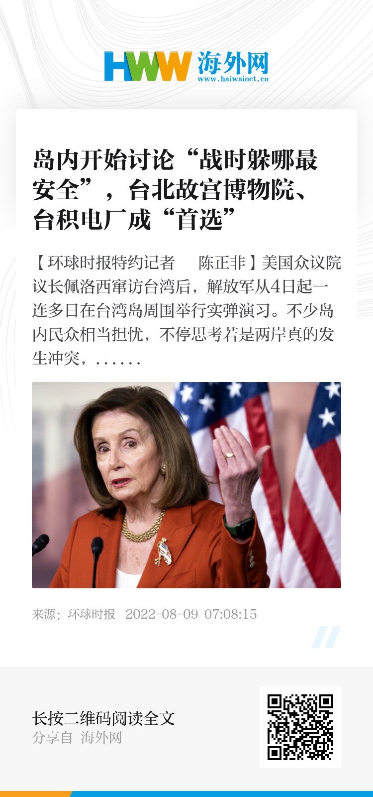 在岛内多项调查中,台北故宫博物院都被认为是最安全的。据台湾中时电子报近日报道,在岛内最大匿名论坛之一“Dcard”上有人于4日当天掀起热议,“如果真的战争了,你会怎么办?”有不少网民称,若两岸真的开战,当务之急是把储蓄全部领出来,准备好充足的物资和药品,躲在防空洞或地下室,切忌外出,且立刻搬离大台北圈、机场、军事要地的附近,而最好的躲藏地点就是台北故宫博物院。实际上,这个说法早在2月俄乌战争爆发时就有人提出,当时民进党前“立委”郭正亮就表示,除了地下室和防空洞,“躲在故宫保证不会被炸!”