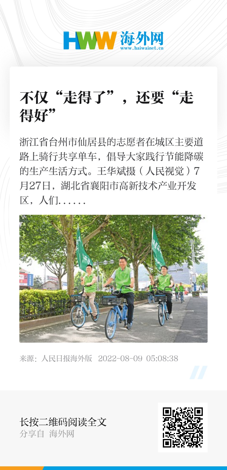 浙江省台州市仙居县的志愿者在城区主要道路上骑行共享单车,倡导大家践行节能降碳的生产生活方式。王华斌摄(人民视觉)