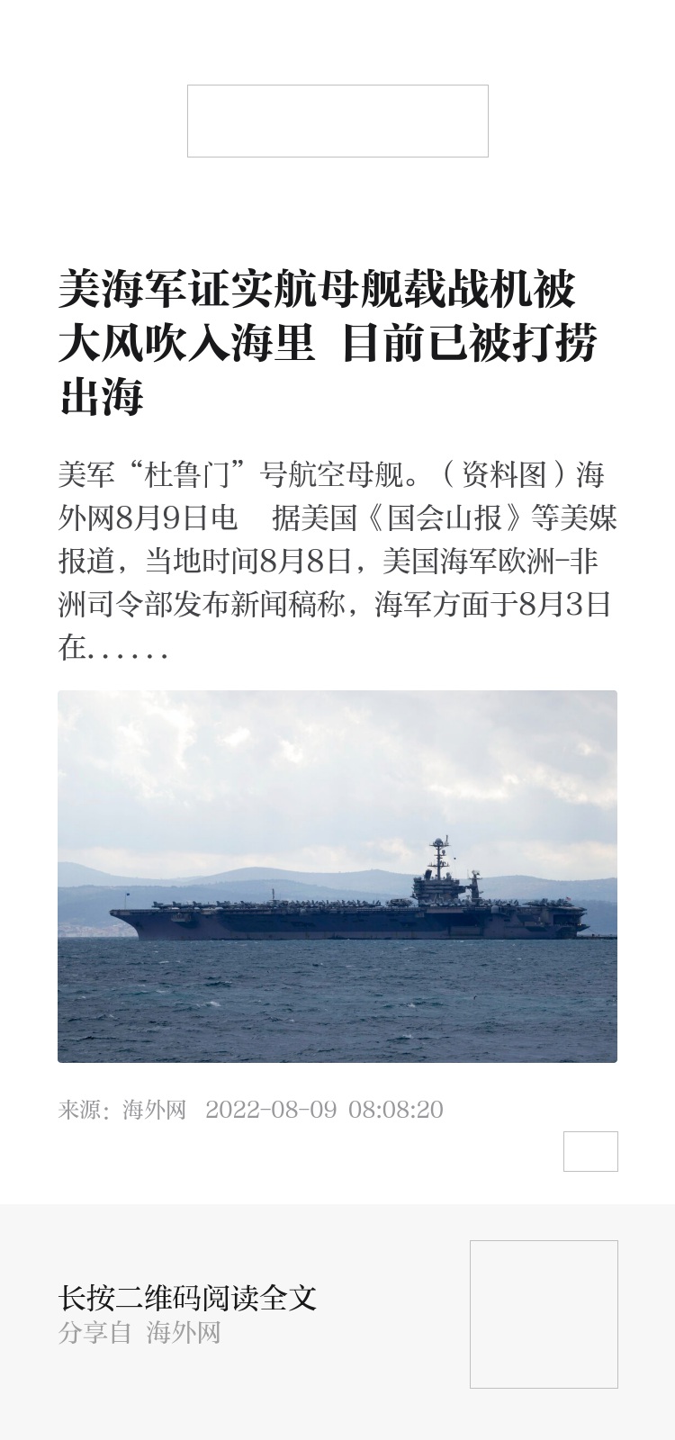 这架战机7月8日从“杜鲁门”号甲板掉入海里时,“杜鲁门”号航母正在恶劣天气中执行补给任务。该战机重达14.5吨,造价约为5000万美元。(海外网 姚凯红)