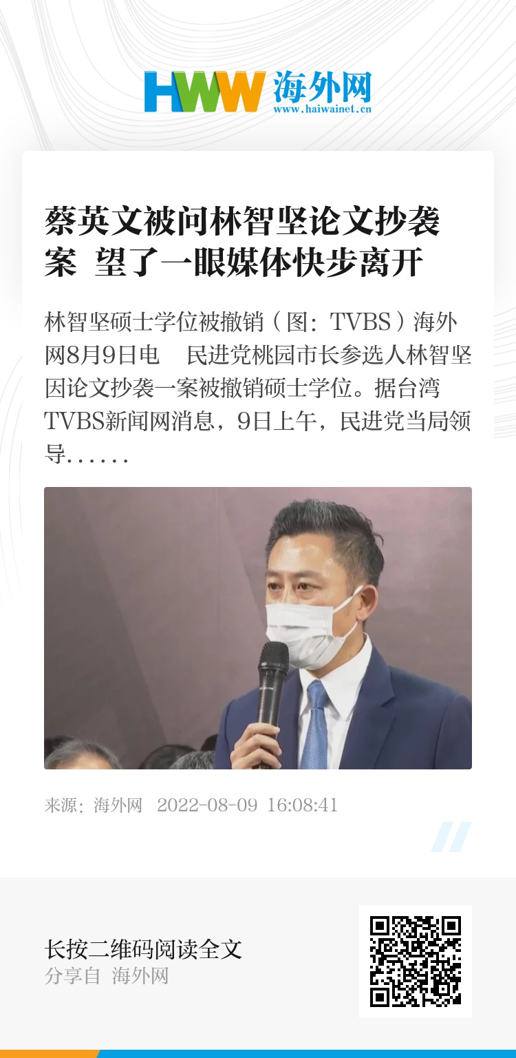 海外网8月9日电 民进党桃园市长参选人林智坚因论文抄袭一案被撤销硕士学位。据台湾TVBS新闻网消息,9日上午,民进党当局领导人蔡英文出席活动被记者问及此事,望了一眼媒体便快步离开,被网友嘲讽。