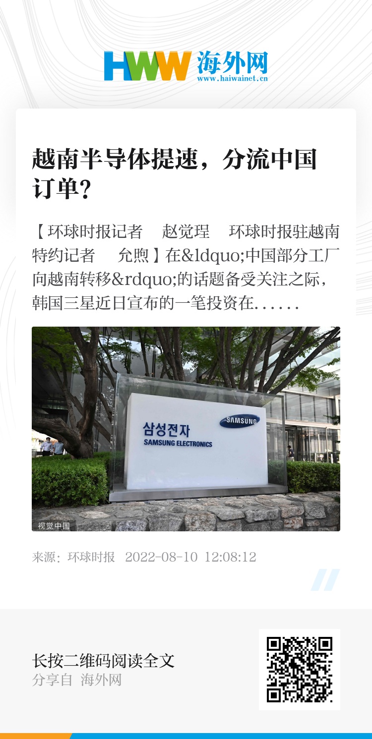 【环球时报记者 赵觉珵 环球时报驻越南特约记者 允煦】在“中国部分工厂向越南转移”的话题备受关注之际,韩国三星近日宣布的一笔投资在半导体行业又添了一把火。据越南媒体报道,三星当地时间5日透露,计划明年在其位于越南的工厂批量生产半导体封装的零部件。《日经亚洲》称,这标志着继家用电器、智能手机后,三星在越南开启第三项业务。业内人士对《环球时报》记者表示,包括越南在内的东南亚地区已是全球半导体产业链上的重要一环,但目前产业仍集中在低利润的封装与测试环节,这也是可能与中国出现竞争的领域。不过,越南等国希望向产业链上游发展,目前难度较大。