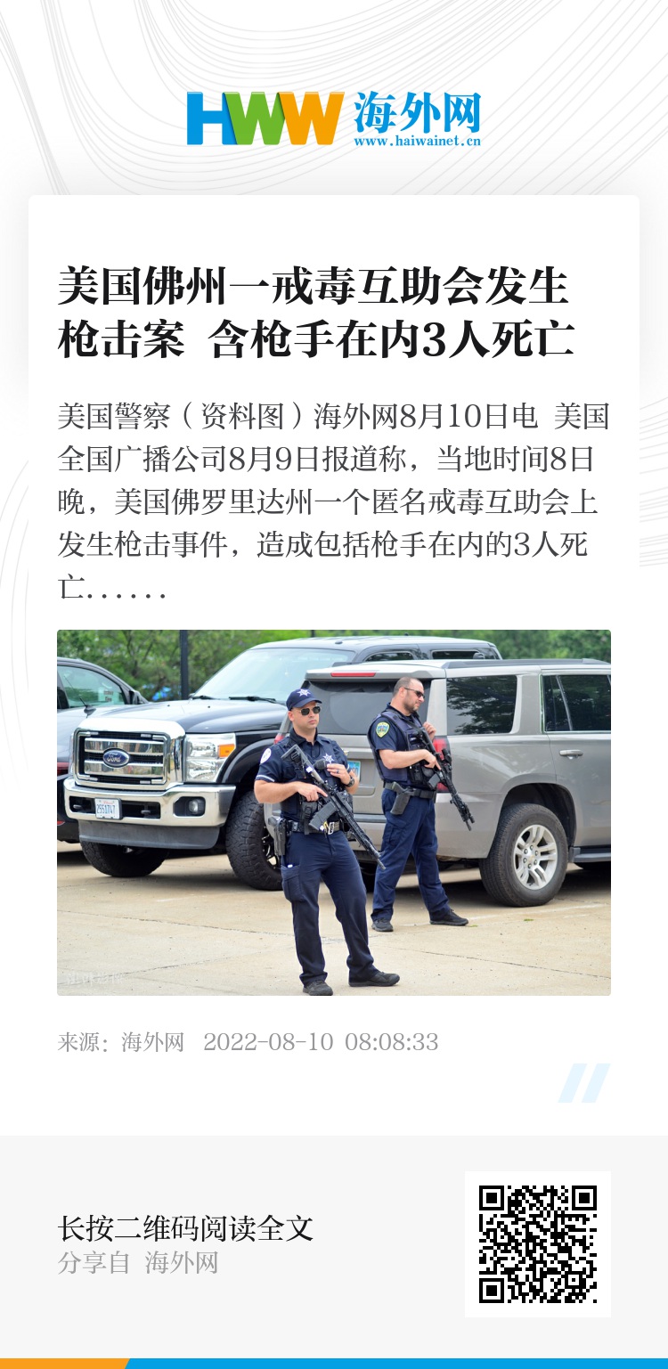 海外网8月10日电 美国全国广播公司8月9日报道称,当地时间8日晚,美国佛罗里达州一个匿名戒毒互助会上发生枪击事件,造成包括枪手在内的3人死亡。