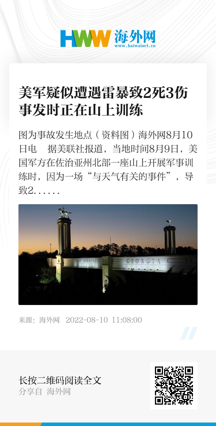 这是一个月以来,佐治亚州第二次出现士兵伤亡事件。7月20日,佐治亚州陆军基地戈登堡一个训练场遭雷击,导致1名士兵死亡,另有9名士兵受伤。戈登堡位于佐治亚州奥古斯塔市郊,是美国陆军网络司令部所在地。(海外网 刘强)