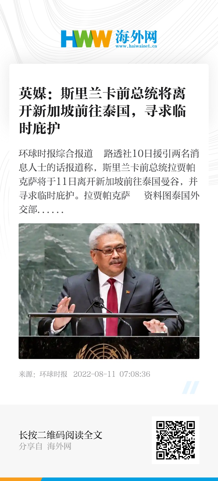环球时报综合报道 路透社10日援引两名消息人士的话报道称,斯里兰卡前总统拉贾帕克萨将于11日离开新加坡前往泰国曼谷,并寻求临时庇护。