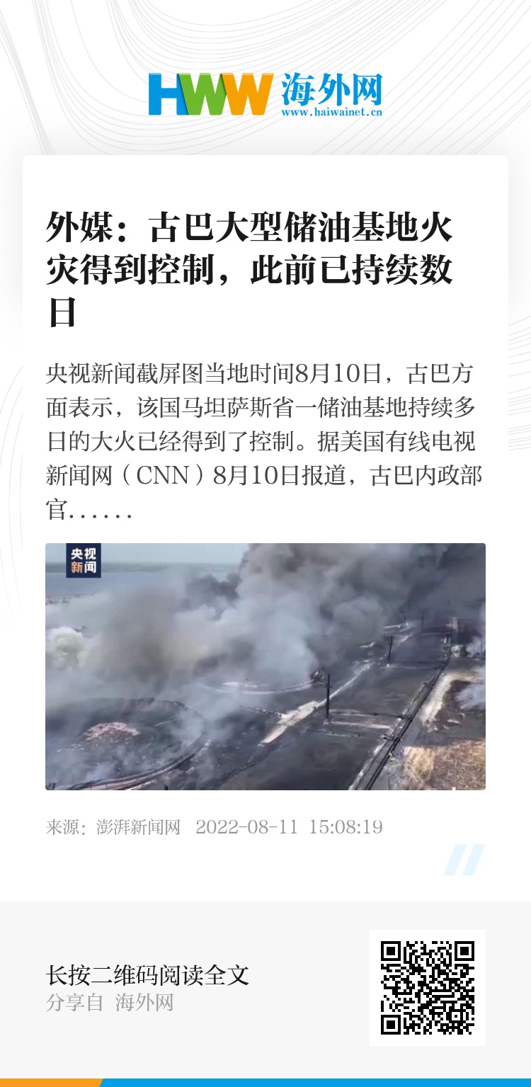 当地时间8月10日,古巴方面表示,该国马坦萨斯省一储油基地持续多日的大火已经得到了控制。