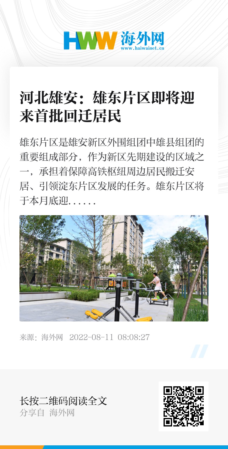 雄东片区是雄安新区外围组团中雄县组团的重要组成部分,作为新区先期建设的区域之一,承担着保障高铁枢纽周边居民搬迁安居、引领淀东片区发展的任务。雄东片区将于本月底迎来首批回迁居民。8月10日,河北雄安,航拍雄东片区A单元安置房及配套设施项目。(无人机照片)中新社记者 韩冰 摄