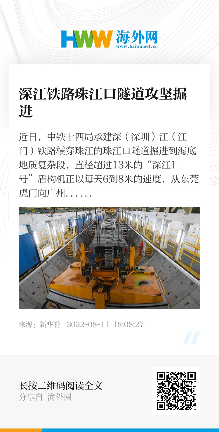 近日,中铁十四局承建深(深圳)江(江门)铁路横穿珠江的珠江口隧道掘进到海底地质复杂段,直径超过13米的“深江1号”盾构机正以每天6到8米的速度,从东莞虎门向广州南沙方向攻坚掘进。深江铁路建成通车后将把深圳、东莞、广州、中山、江门这五座大湾区城市更紧密连接在一起,实现深圳前海自贸区与广州南沙自贸区半小时高铁互联互通,助力打造“轨道上的大湾区”。新华社记者 刘大伟 摄
