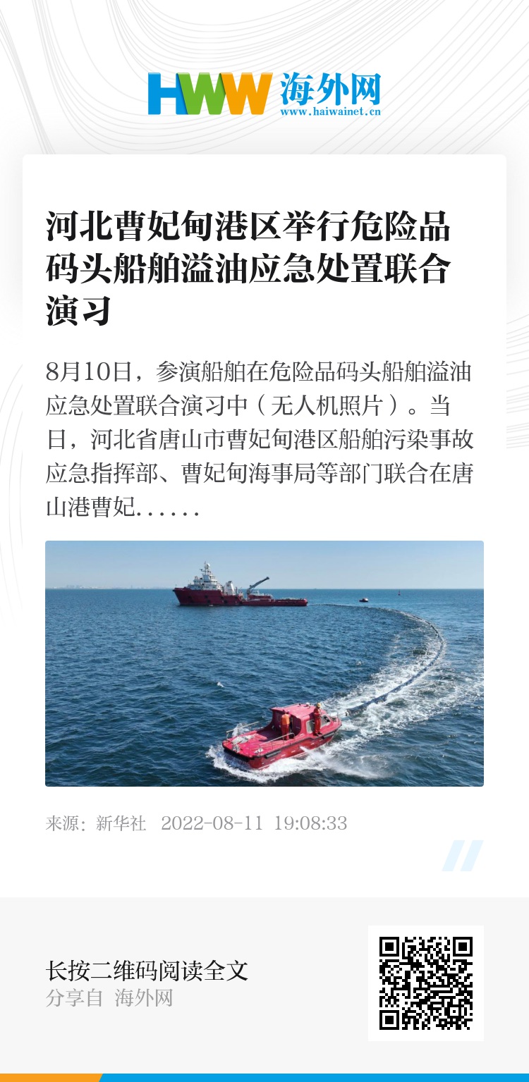 8月10日,参演船舶在危险品码头船舶溢油应急处置联合演习中(无人机照片)。当日,河北省唐山市曹妃甸港区船舶污染事故应急指挥部、曹妃甸海事局等部门联合在唐山港曹妃甸港区液体化工码头举行河北唐山2022年危险品码头船舶溢油应急处置联合演习,检验成员单位应急反应能力,提高海上应急处置实战水平。新华社记者 杨世尧 摄