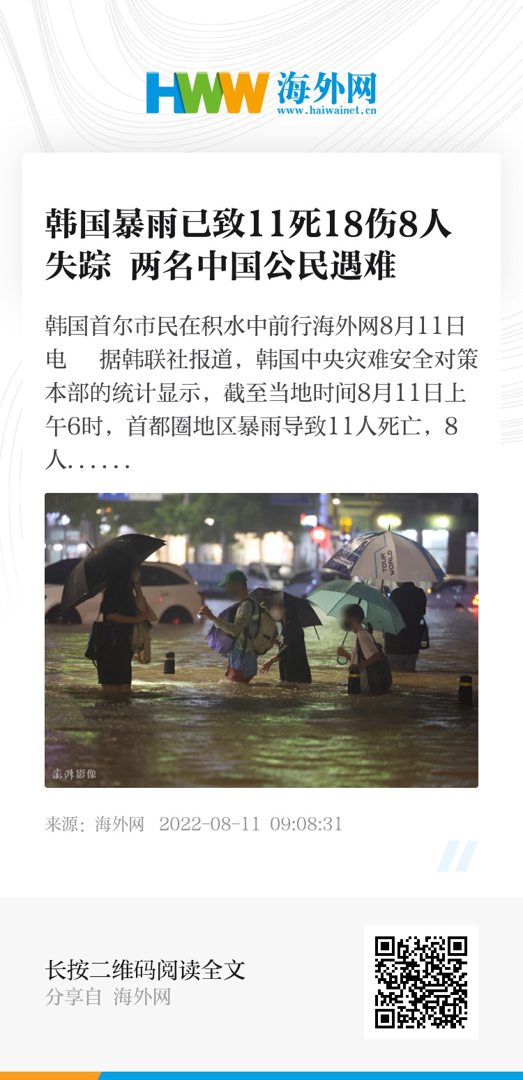 海外网8月11日电 据韩联社报道,韩国中央灾难安全对策本部的统计显示,截至当地时间8月11日上午6时,首都圈地区暴雨导致11人死亡,8人失踪,18人受伤,548户982人受灾。