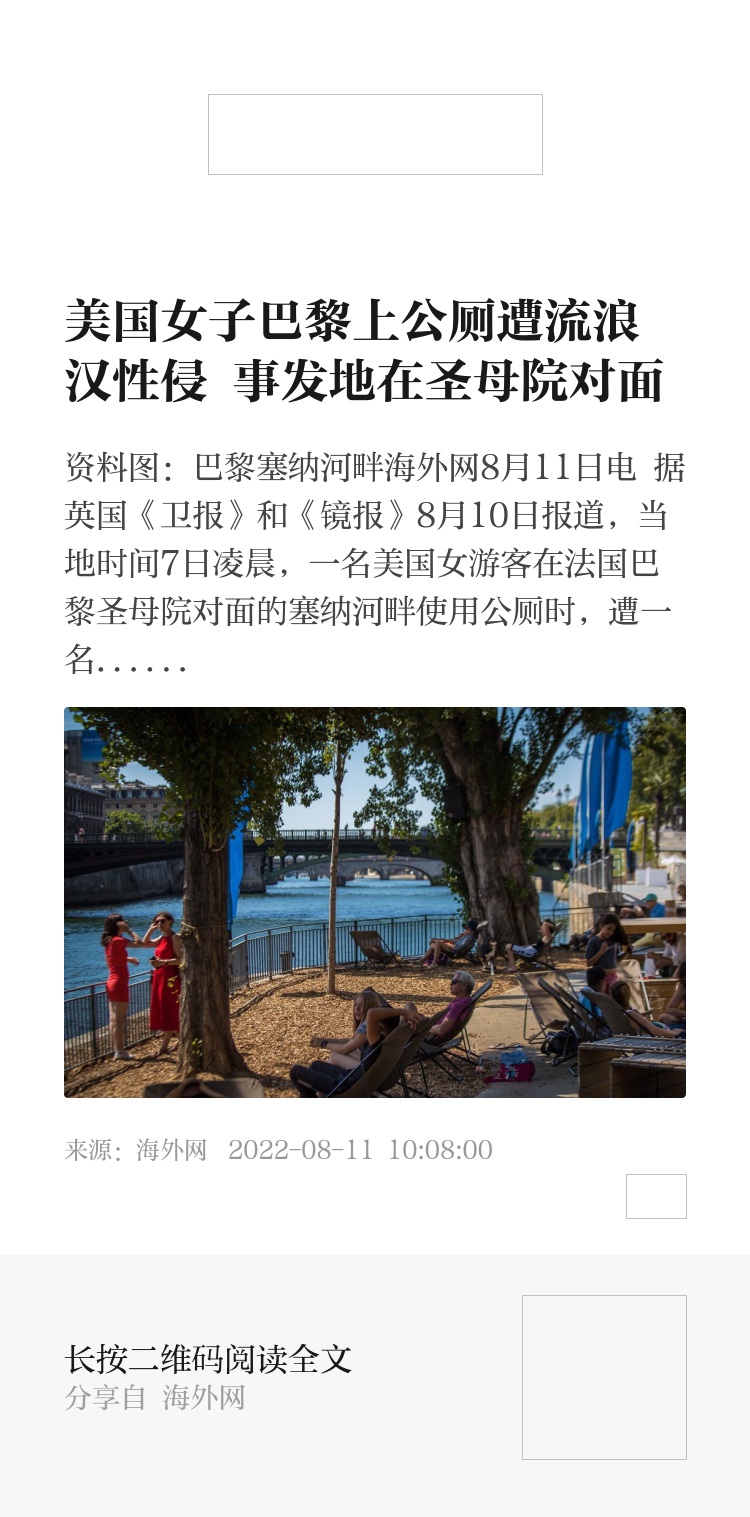 海外网8月11日电 据英国《卫报》和《镜报》8月10日报道,当地时间7日凌晨,一名美国女游客在法国巴黎圣母院对面的塞纳河畔使用公厕时,遭一名流浪汉性侵。事件曝光后,引发舆论对巴黎市中心社会治安的关注。