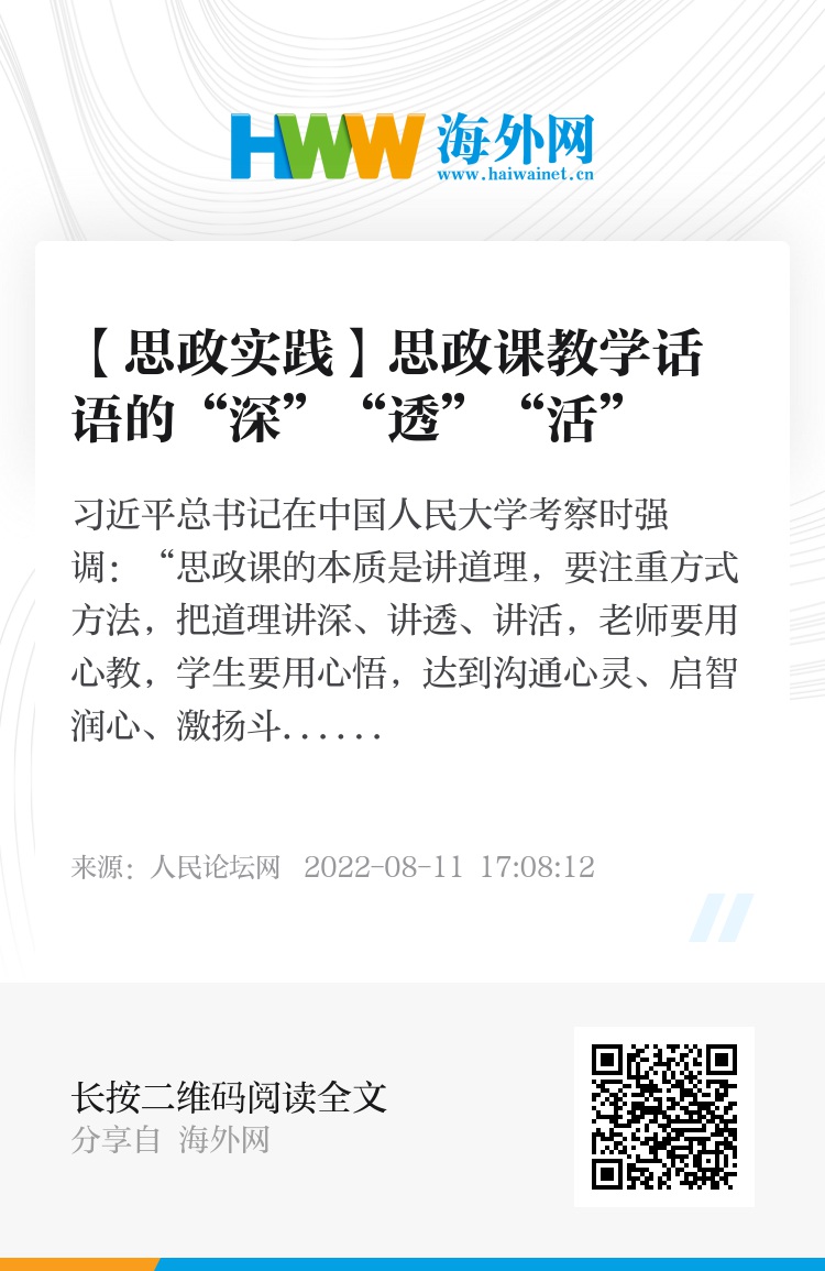 思政课教学话语的“活”作“鲜活”之义,与“刻板”“枯燥”相对。列宁指出:“马克思主义学说不是教条,而是行动的指南。”思政课教学话语要结合实际不断丰富和创新,突破思政课教学话语的抽象、枯燥的刻板印象,提升教育对象对思政课教学话语的接受度,内化于心,外化于行。运用鲜活的材料使思政课教学话语在现实中“活”起来。“‘大思政课’我们要善用之,一定要跟现实结合起来。上思政课不能拿着文件宣读,没有生命、干巴巴的。”要将党史、新中国史、改革开放史、社会主义发展史中人物、事件融入到思政课教学话语中来,用实践证明思政课教学话语蕴含道理的科学性。特别是要活用党的十八大以来的典型实践,不断提升马克思主义理论的真理威力。运用灵活的教学方式使思政课教学话语在互动中“活”起来。“要注重方式方法”,新时代教育对象的社会交往方式形式多样,思政课教学话语互动方式要主动适应教育对象多样的交往习惯,在传统的课堂互动基础上,灵活运用案例探究式、社会调查、翻转课堂、模范人物进课堂、线上学习交流等教学方式,丰富思政课教学话语互动方式,提升教育对象在思政课教学中积极性和参与度。运用通俗幽默的语言使思政课教学话语在理解中“活”起来。通俗易懂、幽默风趣的语言不仅能够吸人,而且能够让人听得“进”,听得“懂”。“微”时代的“碎片化”学习、“读图式”认知,成为教育对象认识、理解、接受新事物的重要方式,注重兴趣、高效,思政课教学话语在保证“深”和“透”的基础上,在通俗性和幽默性上下功夫,将理论话语、教材话语转化为教育对象听得懂、感兴趣的教学话语,增强思政课教学的吸引力和实效性。【本文系安徽省社科规划项目“新时代高校思政课话语传播整体性研究”(项目批准号:AHSKY2020D64)的阶段性研究成果。】(作者:倪松根 安徽工业大学马克思主义学院副教授)